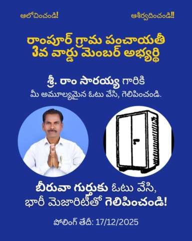 ఐదవ వార్డు అభివృద్ధిని చూసి ఓటేయండి రాం సారయ్యను గెలిపించండి రాంపూర్ మూడవ వార్డు లో బీరువా గుర్తుకు ఓటు వేసి అభివృద్ధికి బాటలు వేయండి రామ్ సారయ్య విజ్ఞప్తి.