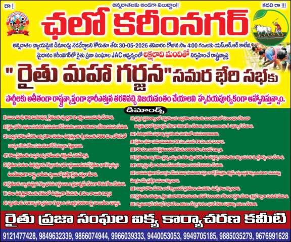 ప్రభుత్వాలపై రైతు గర్జన.. ఏప్రిల్ 28న కరీంనగర్లో ‘సమరభేరి’! – 2 లక్షల మందితో రాష్ట్ర స్థాయి మహాసభ: రైతు జేఏసీ ప్రకటన – మాజీ మంత్రులు హరీష్ రావు, శ్రీనివాస్ గౌడ్ సంపూర్ణ మద్దతు.