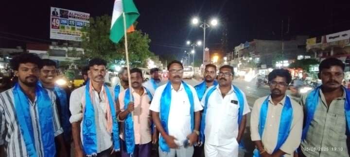 బాహు బలంన్యూస్ హుజురాబాద్ ప్రతినిధి,మే 8: జమ్మూ కాశ్మీర్లోని పహల్గామ్లో గత నెల 22న జరిగిన దారుణమైన ఉగ్రదాడికి నిరసనగా హుజూరాబాద్లో బుధవారం బేడ బుడగ జంగం జన సంఘం ఆధ్వర్యంలో భారీ నిరసన ర్యాలీ నిర్వహించారు. సంఘం రాష్ట్ర అధ్యక్షులు సిరిపాటి వేణు నేతృత్వంలో భారీ ర్యాలీ నిర్వహించారు సంఘ సభ్యులు పట్టణంలోని అంబేద్కర్ చౌరస్తా వద్దకు చేరుకుని ఉగ్రవాదులకు వ్యతిరేకంగా నినాదాలు చేశారు.