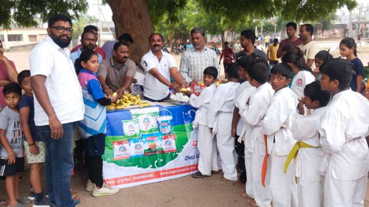 బాహు బలంన్యూస్ హుజురాబాద్, మే 17: స్థానిక హుజురాబాద్ హైస్కూల్ గ్రౌండ్ ఆవరణలో జరుగుతున్న బాలబాలికల వేసవి శిక్షణ శిబిరంలో పాల్గొంటున్న విద్యార్థులకు శనివారం నాగార్జున డెయిరీ ఆధ్వర్యంలో పౌష్టికాహారం పంపిణీ చేశారు.