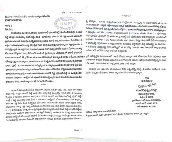 బాహు బలంన్యూస్ హుజురాబాద్:, జూలై 15: శంకరపట్నం మండలం, మొలంగూర్ (గుడాటిపల్లె) గ్రామానికి చెందిన సింగిరెడ్డి శ్రీధర్ రెడ్డి తన కుటుంబానికి ప్రాణహాని ఉందని, భూ వివాదాల నేపథ్యంలో గుర్రం సంజీవ్ రెడ్డి, కిషన్ రెడ్డి కుటుంబ సభ్యుల నుంచి తమకు న్యాయం కావాలని మానవ హక్కుల కమిషన్ను ఆశ్రయించారు.