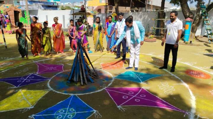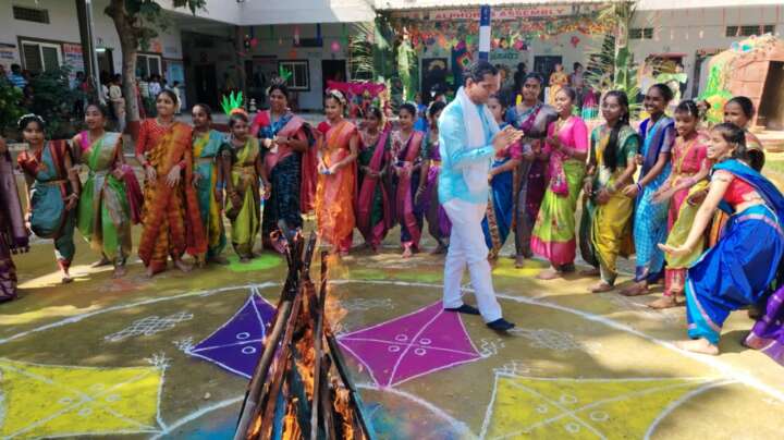అనంతరం డాక్టర్ నరేందర్ రెడ్డి విద్యార్థులతో కలిసి వరి నాట్లు వేసి వ్యవసాయంపై మక్కువను చాటారు. కిండర్ గార్డెన్ చిన్నారులపై భోగి పళ్లు పోసి ఆశీర్వదించగా, సంప్రదాయబద్ధంగా వేసిన భోగి మంటలతో వేడుకలు ఘనంగా ప్రారంభమయ్యాయి. విద్యార్థులు ప్రదర్శించిన సాంస్కృతిక నృత్యాలు, గ్రామీణ వృత్తుల విశిష్టతను తెలిపే వేషధారణలు సందర్శకులను ఎంతగానో ఆకట్టుకున్నాయి. ఈ కార్యక్రమంలో పాఠశాల ప్రిన్సిపల్, వైస్ ప్రిన్సిపల్, ఉపాధ్యాయ బృందం, విద్యార్థులు మరియు పెద్ద సంఖ్యలో తల్లిదండ్రులు పాల్గొని వేడుకలను దిగ్విజయం చేశారు.