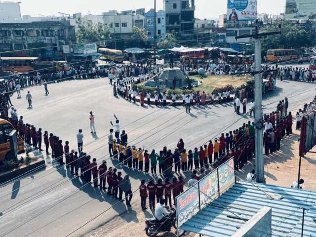 డంపింగ్ యార్డ్ ఏర్పాటును వ్యతిరేకిస్తూ బుధవారం స్థానిక అంబేద్కర్ చౌరస్తాలో వేలాది మంది ప్రభుత్వ, ప్రైవేటు పాఠశాలల విద్యార్థులు భారీ మానవహారం నిర్వహించారు. సుమారు అర కిలోమీటరు పొడవునా విద్యార్థులు రహదారిపై నిలబడి ప్రాజెక్టుకు వ్యతిరేకంగా నినాదాలు చేశారు. జనావాసాల మధ్య డంపింగ్ యార్డ్ ఏర్పాటు చేస్తే జల, వాయు కాలుష్యం పెరిగి ప్రాణకోటికి, వ్యవసాయ రంగానికి తీరని నష్టం జరుగుతుందని విద్యార్థులు ఆవేదన వ్యక్తం చేశారు. ఈ ఆందోళన కారణంగా ప్రధాన రహదారిపై రెండు గంటల పాటు వాహనాలు బారులు తీరాయి. ఆందోళనకారులకు ప్రయాణికులు సైతం సంఘీభావం తెలపడం గమనార్హం.